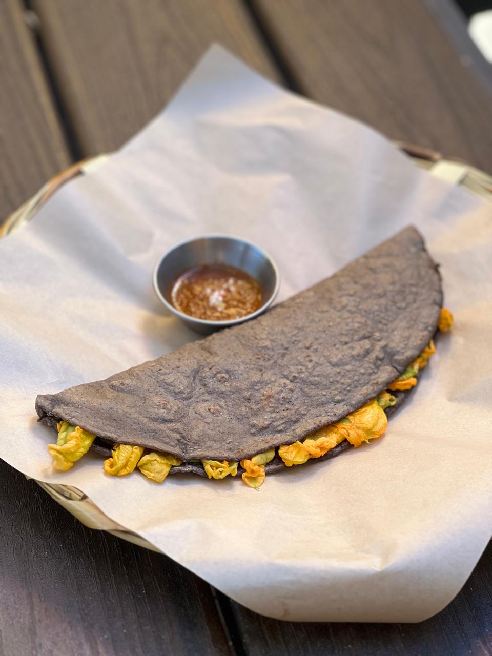Oval shaped thick tortilla filled with ayocote beans, served with cactus, queso fresco, and salsa verde.